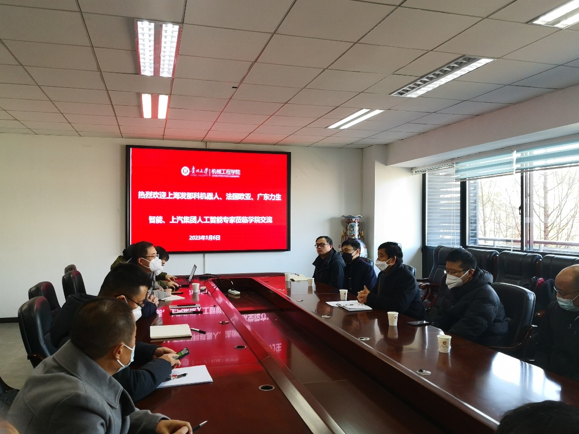 2023年1月6日下午,貴州大學機械工程學院與上海發(fā)那科機器人、法國歐亞集團、廣東力生智能、上汽集團人工智能實驗室以及貴州省政府駐上海辦事處、貴陽市政府駐上海聯(lián)絡(luò)處在機械樓518會議室舉行合作交流洽談會。法國歐亞集團董事長李貴生、上海發(fā)那科機器人市場拓展部副部長張海峰、廣東力生智能有限公司董事長張高強、上汽集團人工智能實驗室總經(jīng)理金忠孝、貴州省駐上海辦事處業(yè)務處副處長王海濤、貴陽市人民政府駐上海聯(lián)絡(luò)處梁華處長出席了會議,機械工程學院趙津院長、張大斌、蔡家斌、唐正強等教授參與了會議。