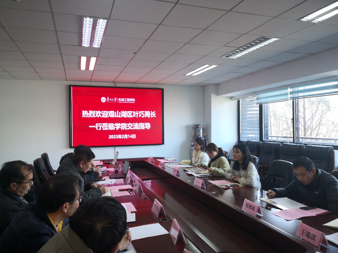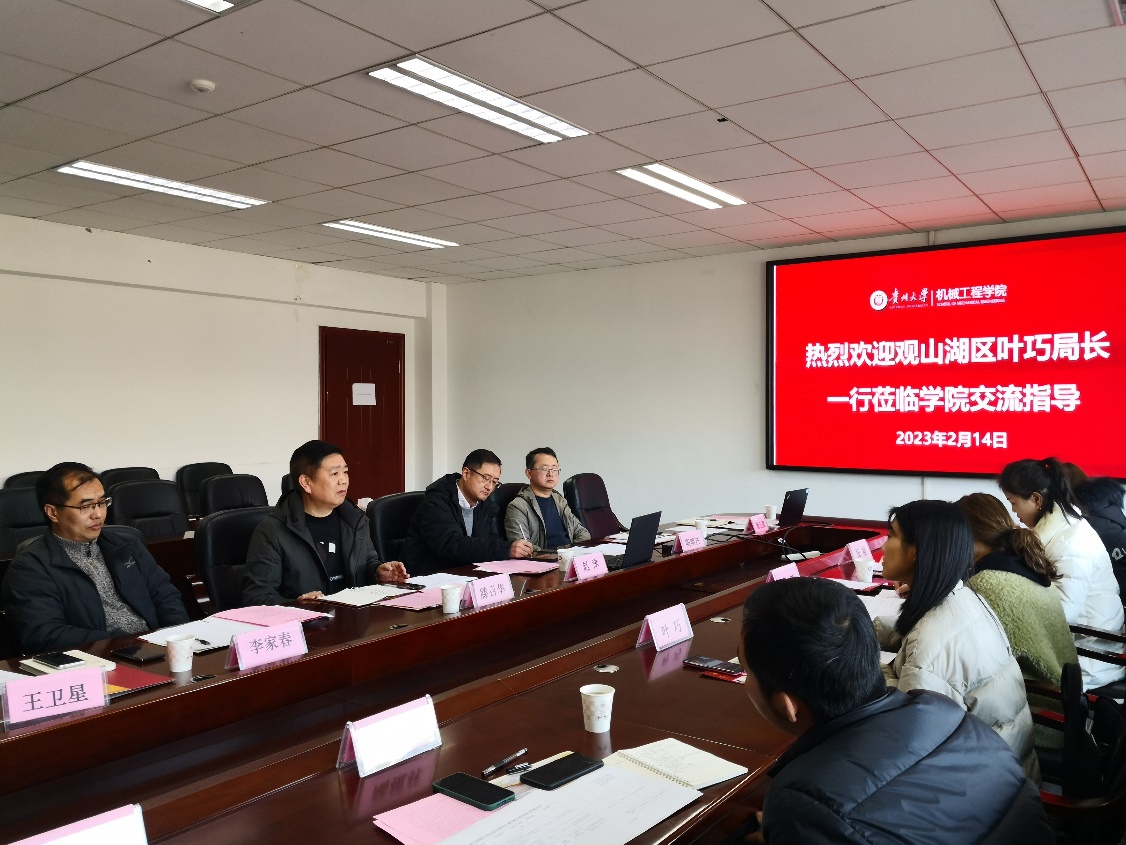 2023年2月14日下午,貴州大學機械工程學院與貴陽市觀山湖區(qū)科學技術局、觀山湖區(qū)工業(yè)和信息化局、觀山湖區(qū)人力資源和社會保障局在機械樓518會議室舉行合作交流會議。觀山湖區(qū)科學技術局黨組書記、局長葉巧,觀山湖區(qū)工業(yè)和信息化局企業(yè)管理服務科陸植林科長,觀山湖區(qū)人力資源和社會保障局就業(yè)服務科李昕科長等出席了會議。機械工程學院黨委書記滕召華、機械工程學院趙津院長、李家春副院長,以及各系室主任和青年教師代表參加了會議。