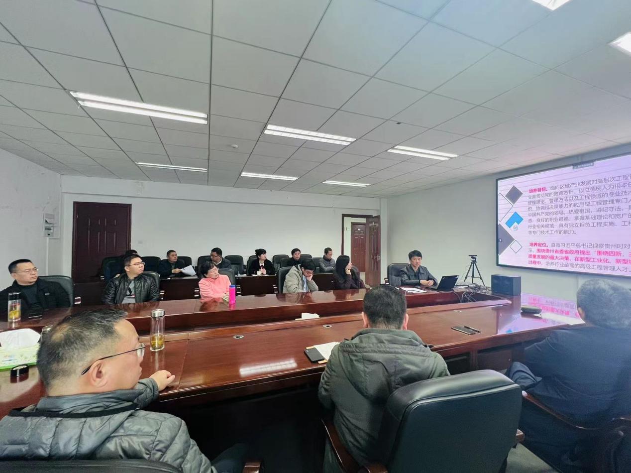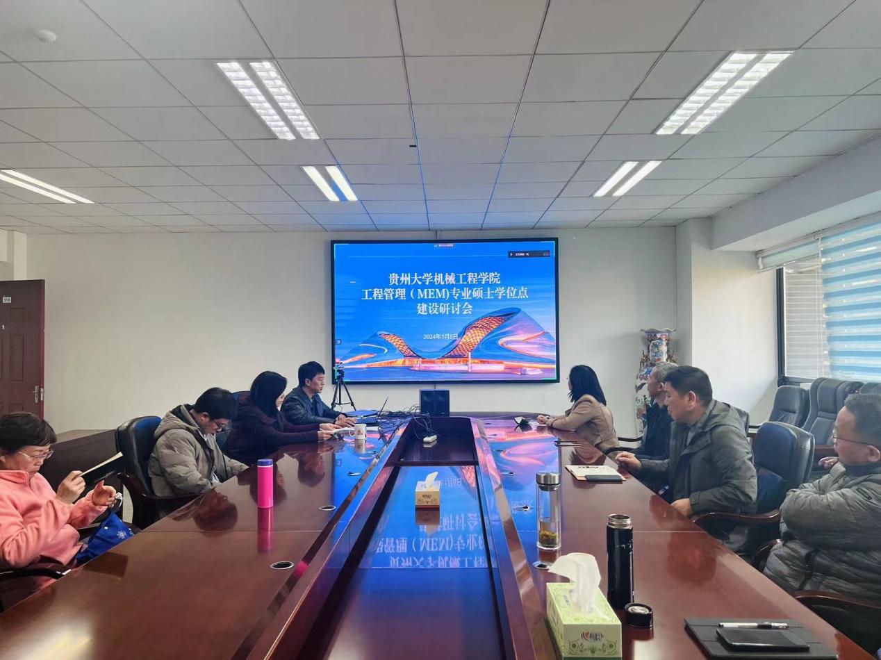 2024年1月6日下午,工程管理學位點全體研究生導師在機械樓518會議室開展工程管理學位點建設發(fā)展研討會。出席本次研討會的成員有機械工程學院黨委書記滕召華,工程管理專業(yè)全體校內(nèi)導師、兩位校外導師代表:貴州建工集團第六建筑工程有限責任公司研究員劉宗瓊和貴州圖智信息技術(shù)有限公司董事長黃勇,其余校外導師線上參與研討會。