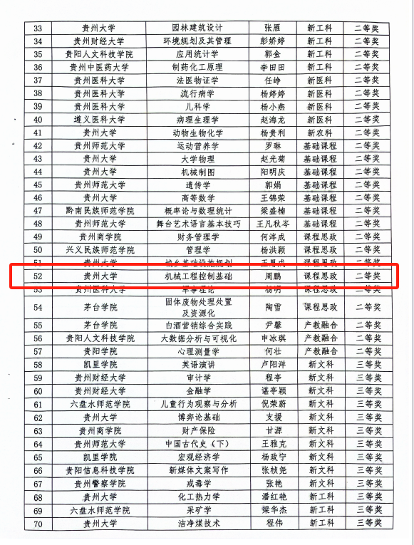 2024年4月,第四屆貴州省高校教師教學(xué)創(chuàng)新大賽在貴州大學(xué)圓滿舉行,我支部書記周鵬同志喜獲課程思政組省級二等獎。高校教師教學(xué)創(chuàng)新大賽是高校教師教育的重要教學(xué)賽事,是以賽促教的重要平臺。今年比賽中,機械工程學(xué)院張富貴老師喜獲省級一等獎、陽明慶和周鵬老師喜獲省級二等獎,實現(xiàn)了機械工程學(xué)院在該項教師教學(xué)競賽中省級獲獎零的突破。