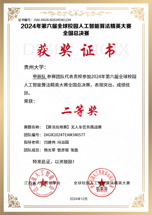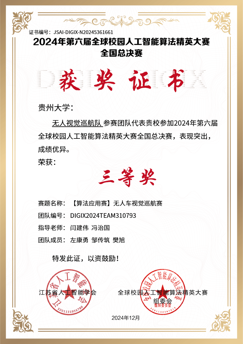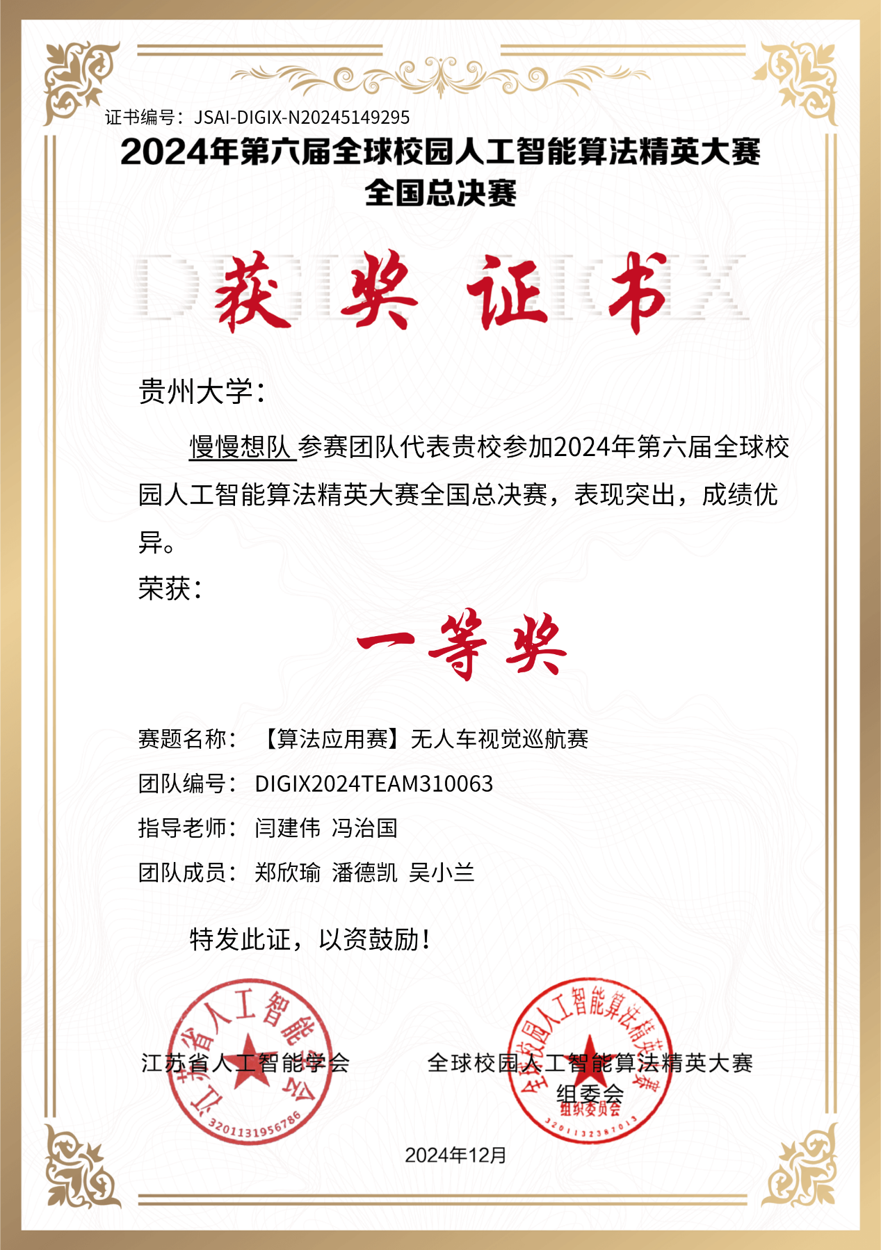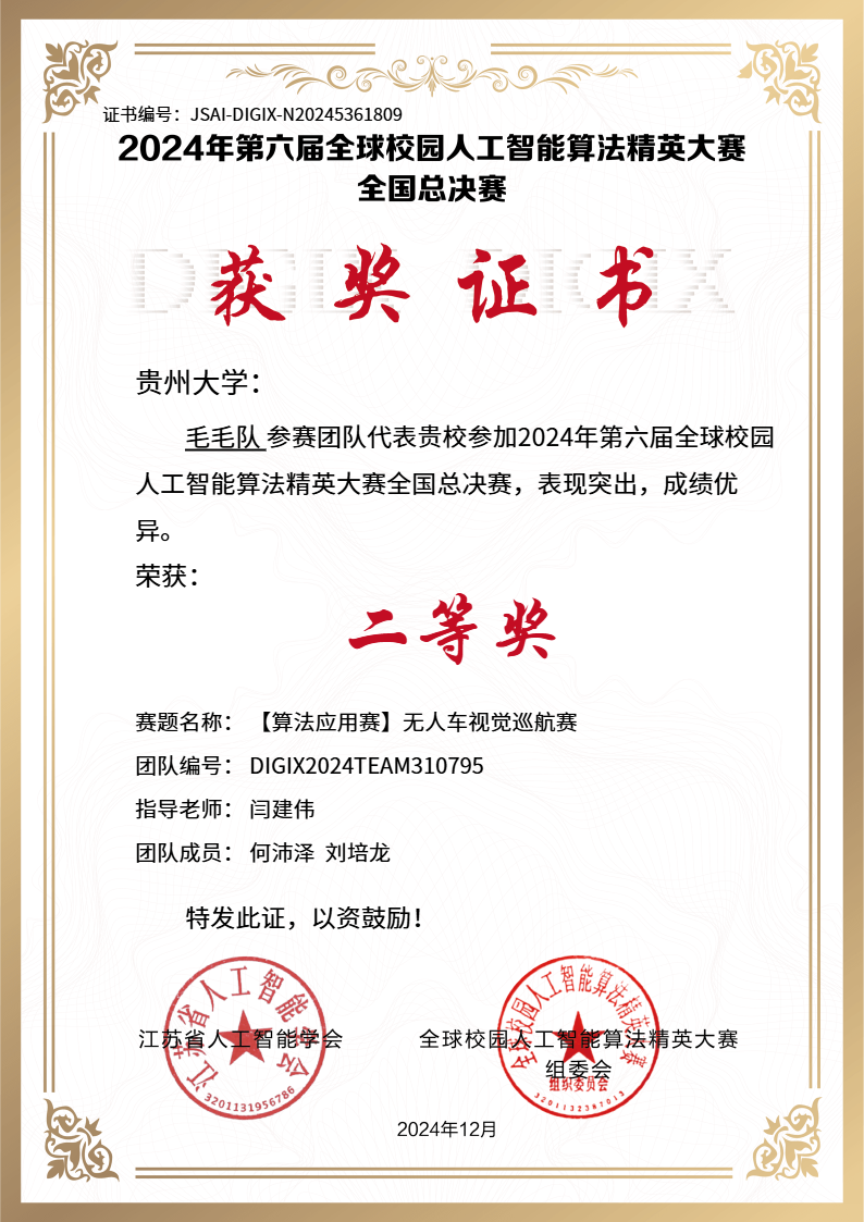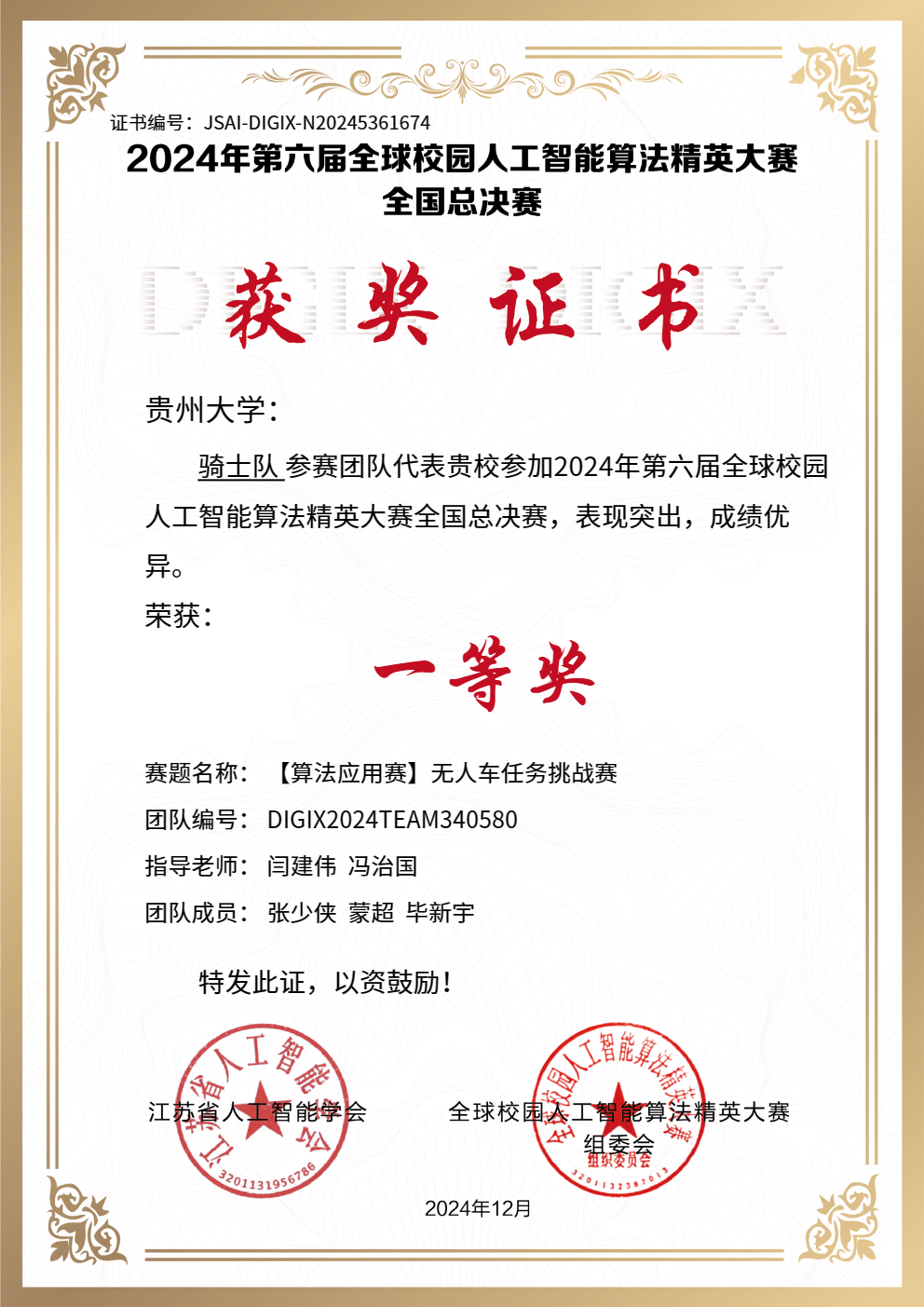 此次全國(guó)總決賽貴州大學(xué)派出由機(jī)械工程學(xué)院閆建偉、馮治國(guó)等老師指導(dǎo)的9支隊(duì)伍參加算法應(yīng)用賽無(wú)人車任務(wù)挑戰(zhàn)賽、算法應(yīng)用賽無(wú)人車視覺巡航賽、算法創(chuàng)新賽人工智能+新農(nóng)科等賽項(xiàng),經(jīng)過(guò)激烈角逐,共斬獲了2項(xiàng)國(guó)賽一等獎(jiǎng)、3項(xiàng)國(guó)賽二等獎(jiǎng)、1項(xiàng)國(guó)賽三等獎(jiǎng),這是繼參加第二十六屆中國(guó)機(jī)器人及人工智能大賽后再次獲得國(guó)賽一等獎(jiǎng)2項(xiàng),再次創(chuàng)造了貴州大學(xué)參加該比賽的歷史最好成績(jī)。