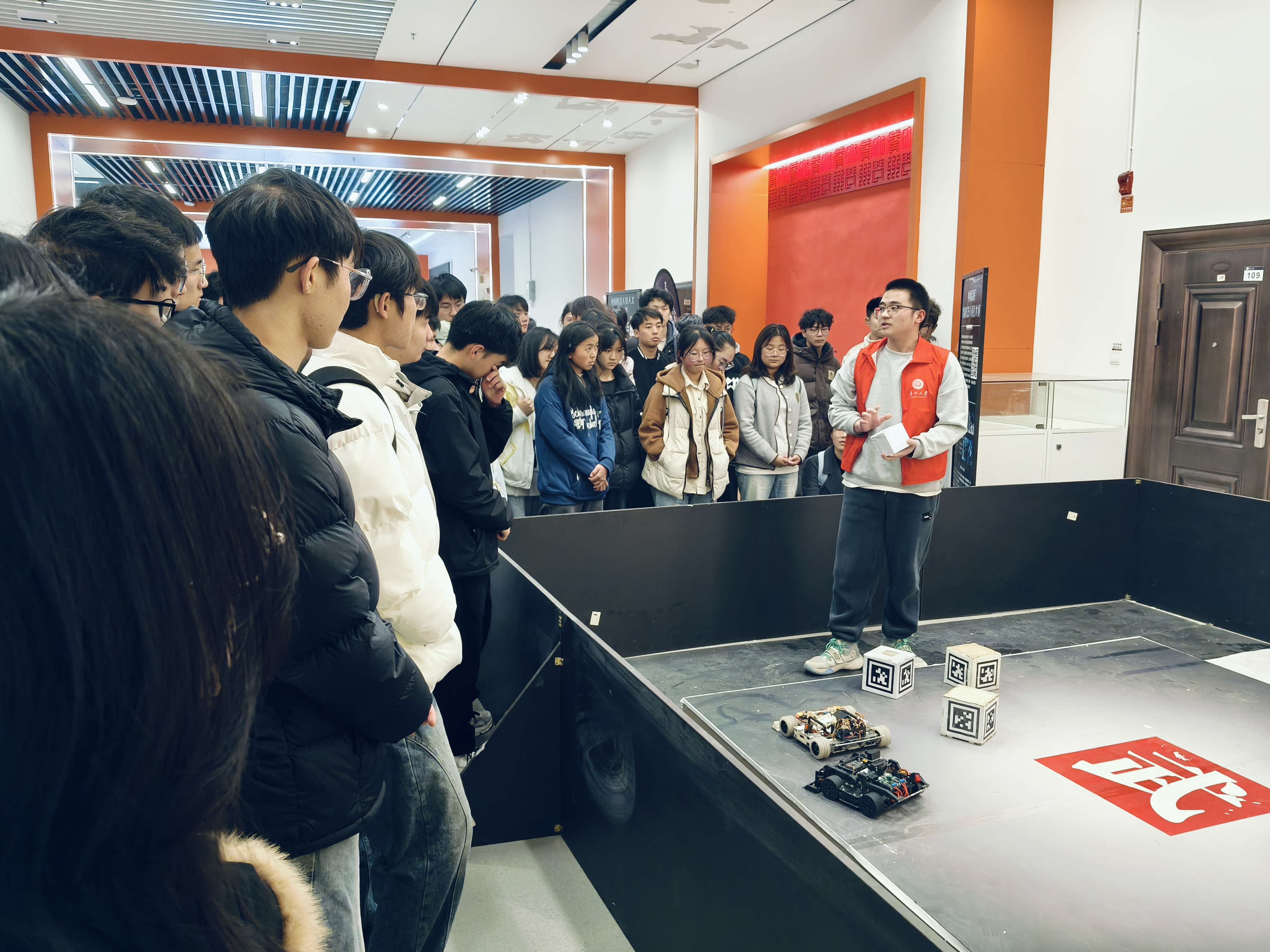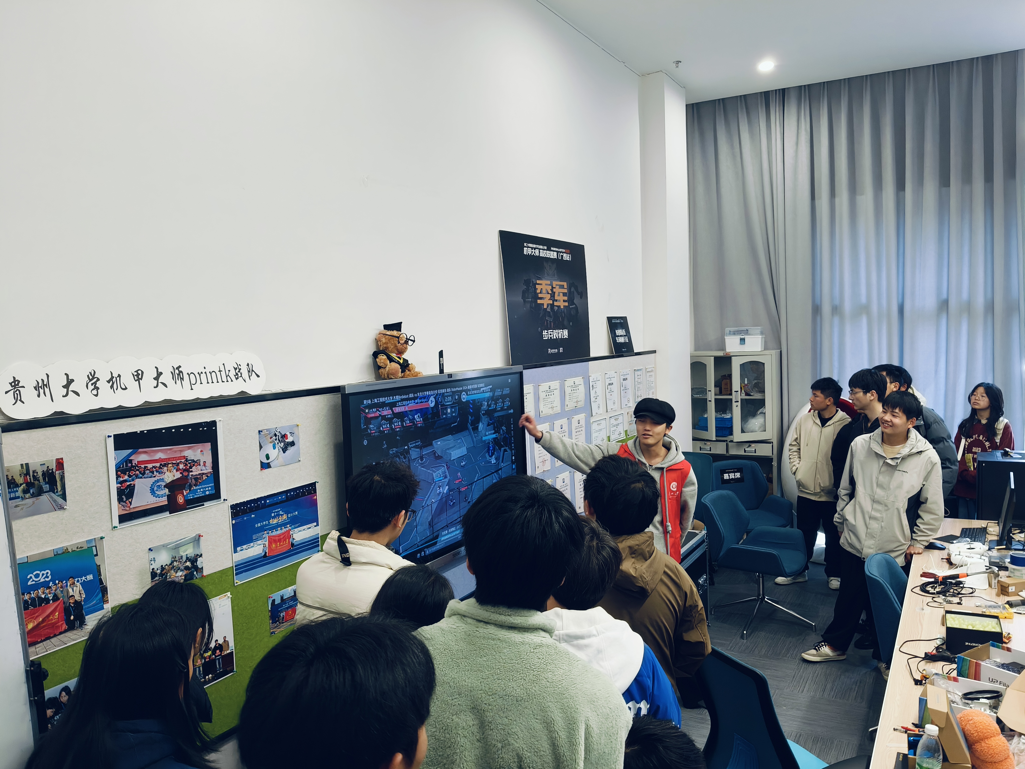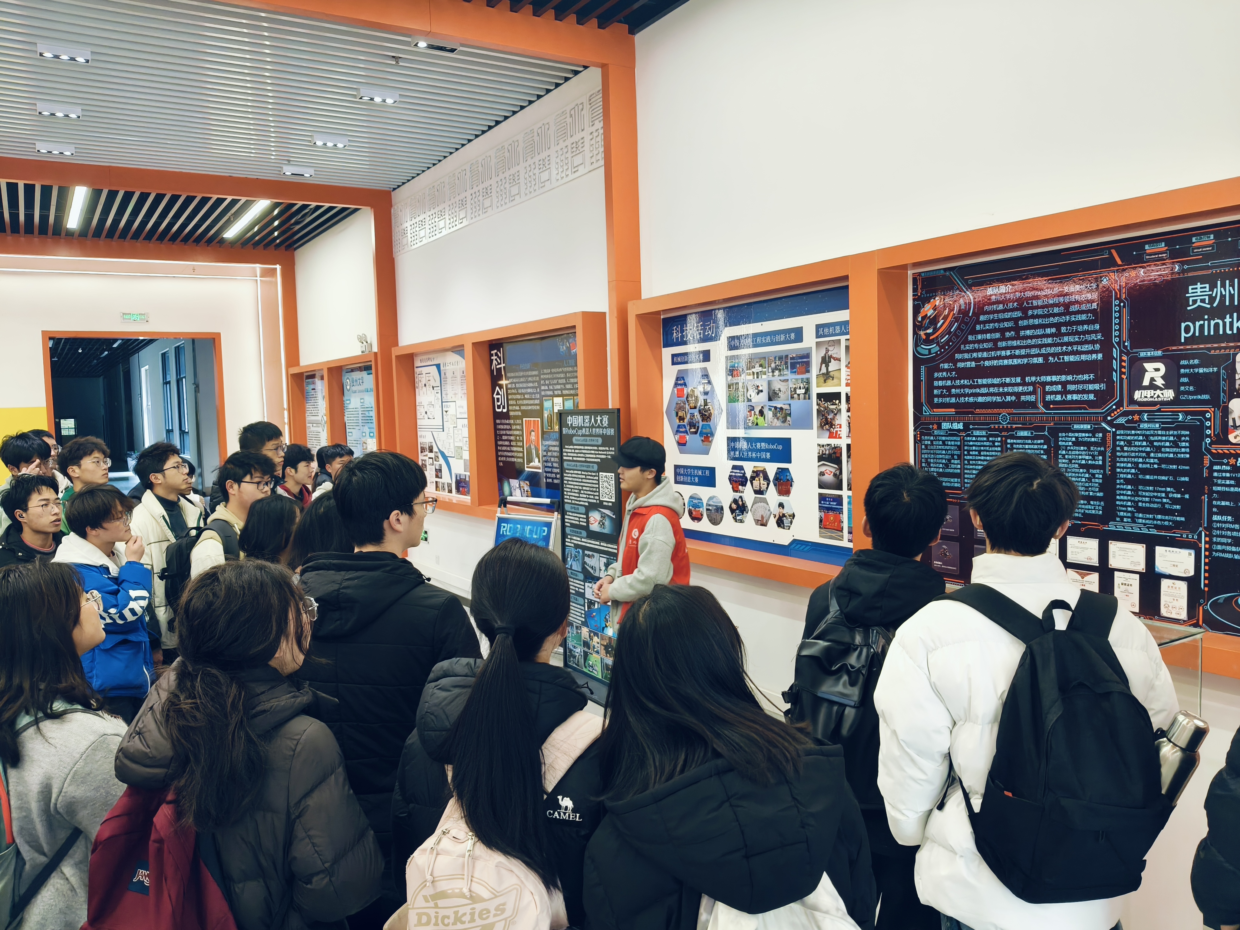 正式介紹優(yōu)秀作品前,馭想俱樂部負(fù)責(zé)人楊春白雪向同學(xué)們介紹習(xí)近平總書記給中國(guó)國(guó)際大學(xué)生創(chuàng)新大賽參賽學(xué)生代表回信內(nèi)容。隨后楊春白雪和機(jī)器人社團(tuán)負(fù)責(zé)人田景怡分別對(duì)兩個(gè)科創(chuàng)社團(tuán)進(jìn)行了介紹并對(duì)相關(guān)賽事進(jìn)行解讀,還向大家展示了貴州大學(xué)代表隊(duì)的獲獎(jiǎng)作品。在參觀robomaster工作室時(shí),獎(jiǎng)杯墻令人震撼。同學(xué)們表示一個(gè)個(gè)獎(jiǎng)杯背后的故事更令人欽佩,激勵(lì)機(jī)械青年守正創(chuàng)新,再創(chuàng)佳績(jī)。