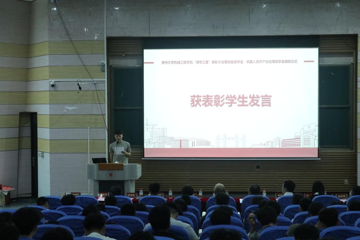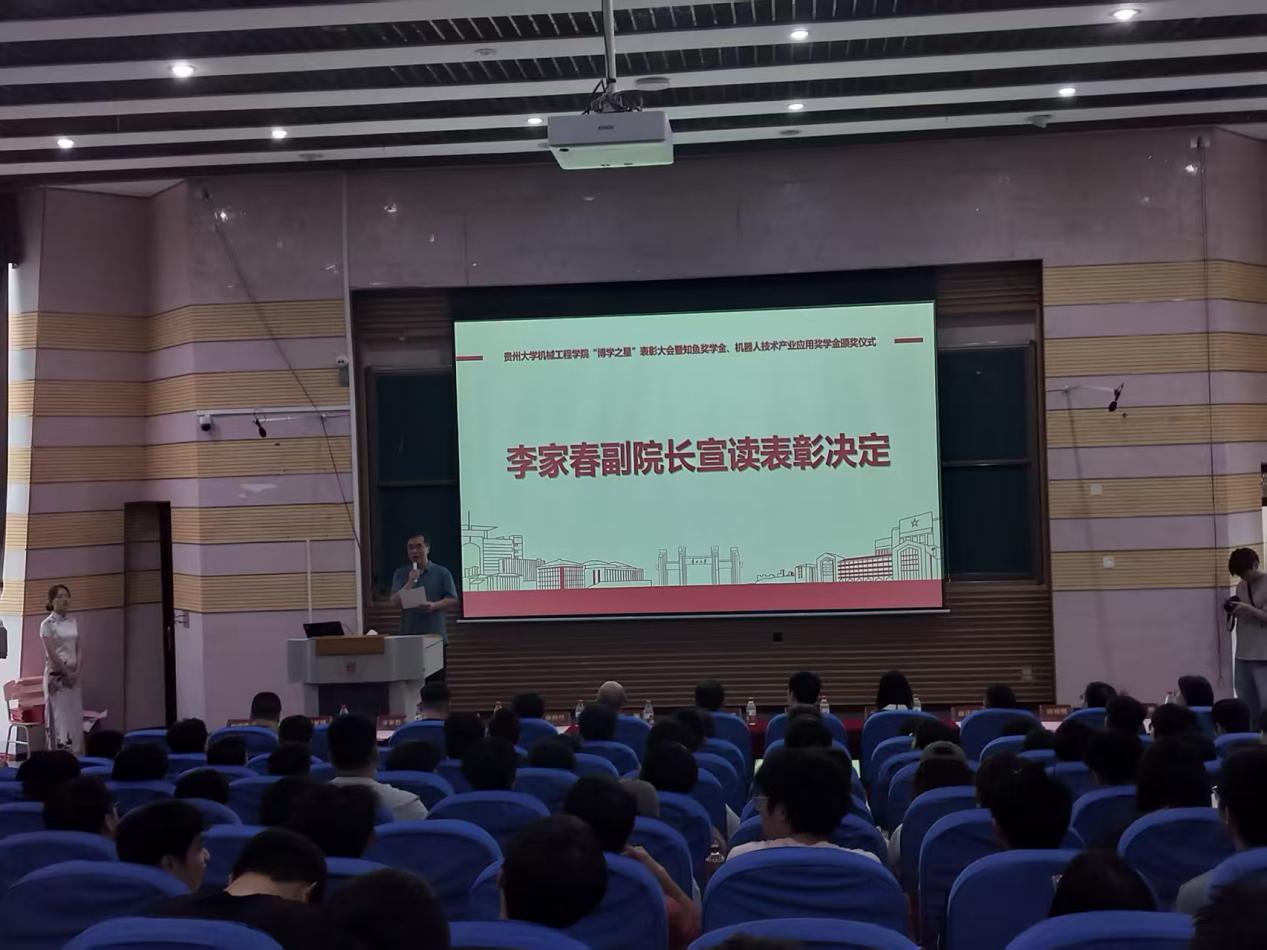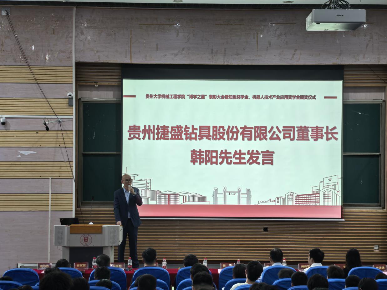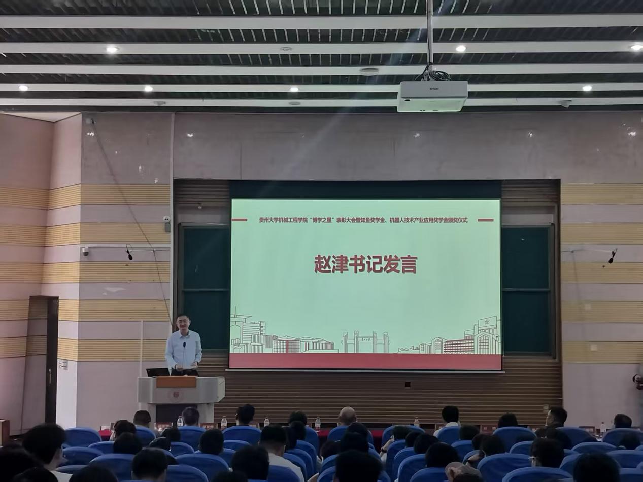 為表彰在學(xué)習(xí)成績、科研創(chuàng)新等方面有突出表現(xiàn)的畢業(yè)班同學(xué),2024年6月27日下午,貴州大學(xué)機械工程學(xué)院“博學(xué)之星”表彰大會暨知魚獎學(xué)金、機器人技術(shù)產(chǎn)業(yè)應(yīng)用獎學(xué)金頒獎儀式在西校區(qū)117報告廳舉行。貴州捷盛鉆具股份有限公司董事長韓陽、重慶安尼森智能科技有限公司技術(shù)總監(jiān)周詩宇、貴州捷盛鉆具股份有限公司供應(yīng)鏈總監(jiān)安燕、國際業(yè)務(wù)二部部長周舒毅、企劃部主管田偉偉與機械工程學(xué)院黨委書記趙津、正處級組織員董蔚然、黨委副書記廖燁、副院長李家春、副院長唐正強出席會議,學(xué)生科全體輔導(dǎo)員、獲獎學(xué)生代表及兩百余名機械學(xué)子參會,大會由學(xué)生科副科長王嘉斌主持。