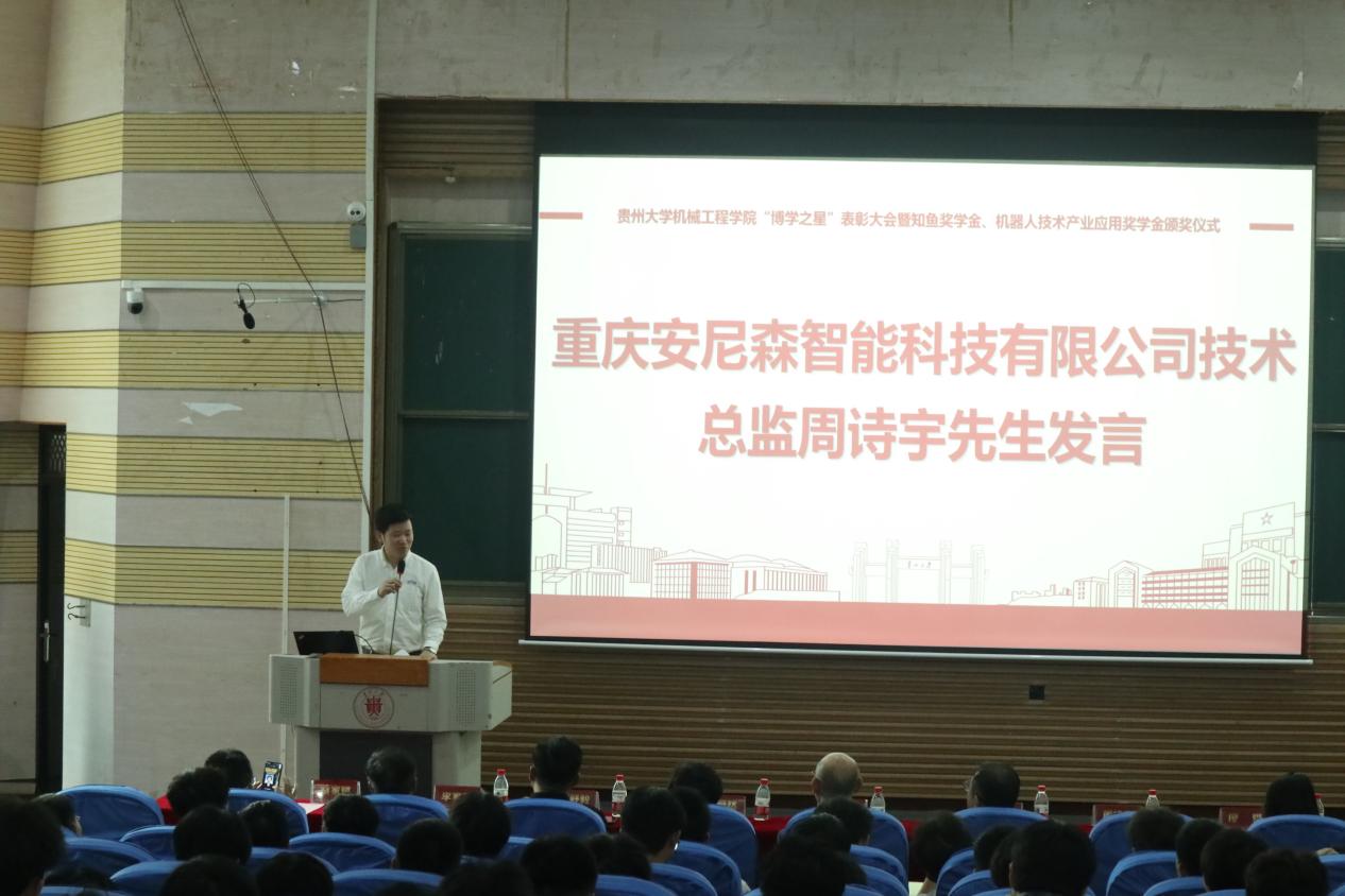 韓陽先生介紹企業(yè)艱難的發(fā)展過程,遇到的難題及解決辦法,鼓勵同學(xué)們要堅持克服困難努力拼搏。同時也強調(diào)人才對于制造業(yè)升級的關(guān)鍵作用,希望機械學(xué)子爭做復(fù)合型人才,并對獲獎學(xué)子寄予厚望,期待未來有更多機械學(xué)子加入產(chǎn)業(yè)報國行列。重慶安尼森智能科技有限公司技術(shù)總監(jiān)周詩宇講述他的成長經(jīng)歷,分享科技創(chuàng)新心得,鼓勵同學(xué)們夯實基礎(chǔ)、勇于探索,積極投身智能制造領(lǐng)域,為產(chǎn)業(yè)發(fā)展賦能新質(zhì)生產(chǎn)力。